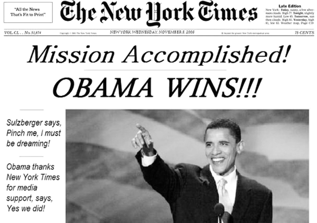2008年11月5日,《纽约时报》登载新闻头条“使命完成!奥巴马赢了!!!”