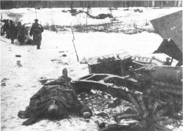 除了丢下大量武器装备物资和官兵尸体,德国人还在沃洛科拉姆斯克丢下了一个绞刑架。直到苏军第1 近卫坦克旅摩托化步兵营连长里亚博夫和他的士兵来到边上时,绞架上8 具冻得硬邦邦的尸体—6 位男性、2 位女性,他们是8名从事游击活动的苏联共青团员[98]—还没有被解下来。