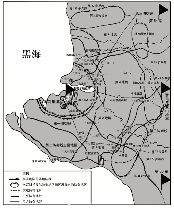 赫林诺夫少将根据他在敖德萨的经验,对原有的三道防线配置做了大幅度修改,把原来设防薄弱的主要防御地带作为最重要的防线,并把该防线向前延伸到和前进防御地带相接触的地方。这样一来,苏军原有的3 道防线实际上变成了2 道(当然不包括斜切阵地):前进防御地带的4 个独立支撑点,和主要防御地带共同构成了塞瓦斯托波尔第一道防线,而直接设在塞瓦斯托波尔城郊的后方防御地带,则成为了第二道防线。在塞瓦斯托波尔防区成立后,这两道环形防线,从北到南,划分为第4、3、2、1 防御地境,分别防守通往塞瓦斯托波尔的4个主要方向。每个防御地境,设置一个师长担任指挥长。