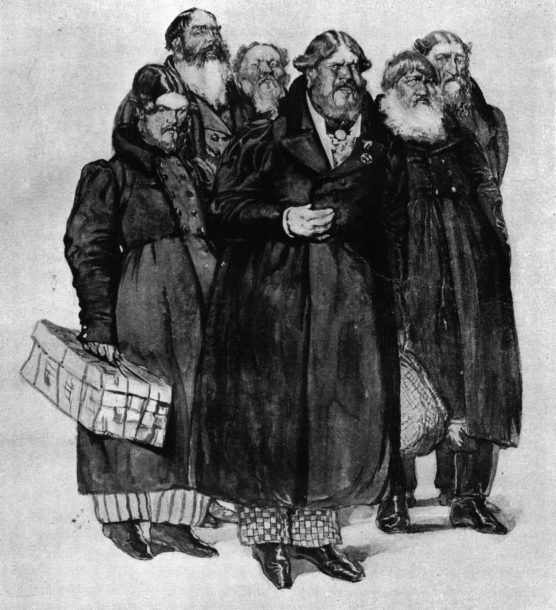 商人们 真是的!这样的市长谁也从来没有看见过。只要一看见他来,就得把铺子里的东西全都藏起来。精致的东西不必说,就是乱七八糟的东西他也要拿,有一种黑枣已经放在桶里七年,连我铺子里的伙计都不要吃,他却整把地抓取。 他的命名日[5]本来是安东,在那一天已经送去了不少东西, 一点也没有短少! 但是不行,还要送礼,他说,渥奴佛里也是他的命名日。有什么法子? 在渥奴佛里的日子也只好送去。