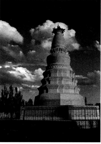 白马塔位于县城西沙州故城内东南角。相传苻秦建元二十年(384年)大将吕光征西胜利凯旋,随带西域高僧鸠摩罗什东传佛教,道经敦煌,所乘白马病死,曾葬于此,后建塔志之,故名。塔为九层,高约12米,最低一层为八角形,每角面宽3米,直径7米;第二层至第四层为折角重叠形,第五层周有突出之乳钉,上为铆连瓣;第六层为复钵形塔身;第七层为相轮形;最上为六角坡顶刹盘,每角挂有一铃。第二层有镌石两块,刻木一块,石上有“道光乙已桐月白文新重”刻字,木刻有“民国二十三年八月拔贡朱永镇、吕钟再修”题记。敦煌人对于佛教的信仰,继而转化为对佛学大师的尊崇。从西域辗转而来的高僧鸠摩罗什怎么也不会想到,自己一匹普通坐骑的死亡,会引起敦煌人的极大关注,祭奠、修塔,使一匹白马得到了永生。以致后来传说,这是一匹如何如何神奇的马,祭祀这匹神马的风俗由此传了下来。每年四月初八,乡民纷涌而来,在白马塔焚香祭拜,热闹非凡。