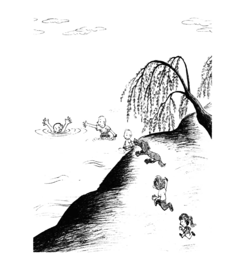 只见弟弟半跪在岸边,虎子咬着他的背心往岸上拽,湿漉漉的岸边滑溜得厉害,他好不容易爬上来又滑倒了,干脆抱住虎子往岸上慢慢挪。我一看松了口气,再看海峰在水里乱扑腾,小军一边小心翼翼地淌着水靠近他,一边呵斥虎子去深水拉海峰,父亲正踩折一株小树。
