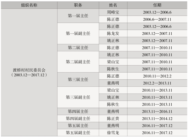 表8-8 2003年—2017年渡桥村行政组织领导人更迭表