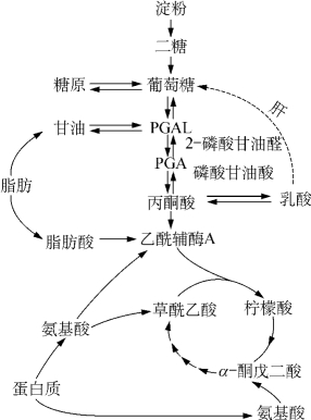 要强调的是生命体中氮元素代谢的平衡是需要在碳元素及其他各类营养素相互配合下对人体发挥生理功能的。它们之间在体内不是独立存在而是密切联系的,既相互配合,又相互制约,如果由于氮元素过多吸收而造成营养失衡,人体的新陈代谢也将失去平衡,就会引发各种疾病。糖、脂肪和蛋白质三大营养素之间相互的关系表现最突出的就是糖和脂肪对蛋白质的调节作用。糖、脂肪和蛋白质都可以生热,但糖以生热为主,脂肪兼有供给脂肪酸和能量储备的作用,蛋白质主要供给氮,可以合成机体组织。蛋白质、脂肪、糖类在体内氧化都可以产生热量,而且三者在代谢过程中可以相互转化,氨基酸经脱氨基作用,其中不含氮部分可合成糖类和脂类,葡萄糖亦可转变成脂类。从图5-79可知,由蛋白质消化而产生的氨基酸,可以转化为乙酰辅酶A以及柠檬酸循环中的一些中间酸。由脂肪消化而产生的脂肪酸,可以转化为乙酰辅酶A。脂肪消化的其他产物(甘油),可转化为PGAL(2-磷酸甘油醛)和PGA(磷酸甘油酸),再成为丙酮酸。乳酸可以被肝脏转回为葡萄糖。