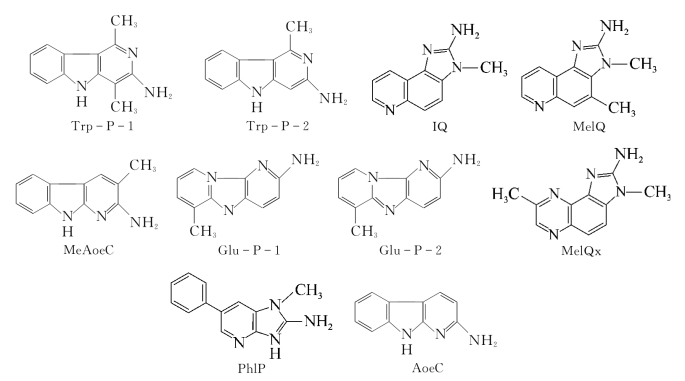 不仅仅是亚硝胺,食物中蛋白质成分在高热情况下还会形成对人体有害的低分子有机化合物,例如杂环胺(HCAs),它具有强烈的致突变作用,在多种动物的不同组织或器官可以诱发肿瘤。迄今为止,已发现的HCAs有19种,其中对动物致癌的有10种,如图5-78所示。