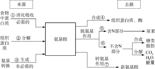 对人体而言,我们确实需要很多的蛋白质和氨基酸,可是与吸收糖类化合物和脂类物不同的是,人体内却没有氨基酸的储存形式,这是人体中氮元素存在的特殊之处。人体内仅是有着一个不断变化的氨基酸库(见图5-74),组织蛋白不断地分解和重新合成。在肝和血液中,氨基酸的变换是相当迅速的——每6天就能换掉一半,这种变换在肌肉和支撑性组织里要缓慢得多——肌肉里每180天才能被换掉一半氨基酸,在支撑性组织里的胶原每1000天才能被换掉一半。