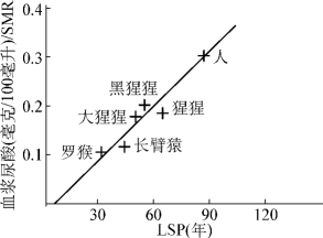 科学家的研究还发现尿酸对物种寿限的长短起着重要作用。通过测量几种灵长类动物血浆中尿酸含量和物种的基础代谢率(SMR)的比,发现这个比值与寿限有很好的相关性(见图5-77)。其原因也许是血液中尿酸的含量与营养水平有关。