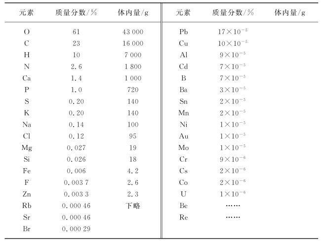1975年,Snyder给出了“标准人”的化学组成,该“标准人”又称为“参比人”,它是指:鲜重70千克,由60千克软组织另加10千克骨骼所组成的人,其具体组成见表3-2。从表中可以看出:人体中含量占前十二位的元素有氧、碳、氢、氮、钙、磷、硫、钾、钠、氯、镁、硅。与在这以前的一些研究所发表的数据相比,硅的含量有了变化,它已成了人体中含量较高的微量元素(比铁的含量要高,但以前有一些文献说是硅比铁要低)。有关人体中化学元素组成的数据在不同的文献中是有着一定的差异的。