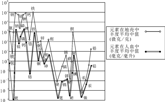 英国地球化学家哈密尔顿(E.Hamilton)在1979年发表了重要论文《人体组织中的金属元素和环境因素的关系》,介绍了他的研究组从20世纪60年代以来,用当时最新的火花源质谱法测定了220例英国人体组织中从氢到铀的各种元素的含量,获得了上万个数据。结果发现它们的含量与地壳中元素的分布有着惊人的相似(见图3-7)。他把人体各组织(如肝、肾、心脏、脑、脾、尿、肌肉及血液等)中的元素含量与人类从古到今的生活环境(如海洋、大气、土壤、岩石及各种食物)中的元素分布进行对比,观察到人体血液中60多种化学元素的平均含量与地壳元素的分布明显有关。