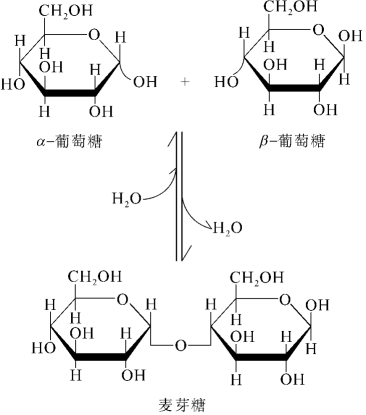一分子葡萄糖跟一分子果糖失去一分子水而缩合在一起就成为蔗糖。蔗糖是由两个单糖缩合生成的,因此叫做二糖。麦芽糖、乳糖也是二糖,它们是同分异构体。两分子葡萄糖缩合就成为麦芽糖,如图4-8所示。麦芽糖可以由淀粉在α-淀粉酶催化下水解得到。一分子葡萄糖跟一分子半乳糖缩合就成为乳糖。蔗糖和乳糖的结构或如图4-9所示。