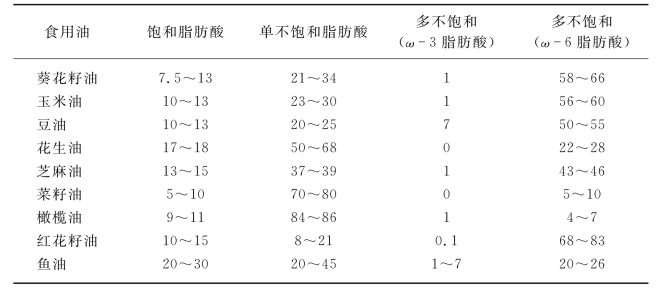 常见食用油中饱和脂肪酸、单不饱和脂肪酸以及多不饱和脂肪酸中ω-3脂肪酸和ω-6脂肪酸的含量列于表4-3中。