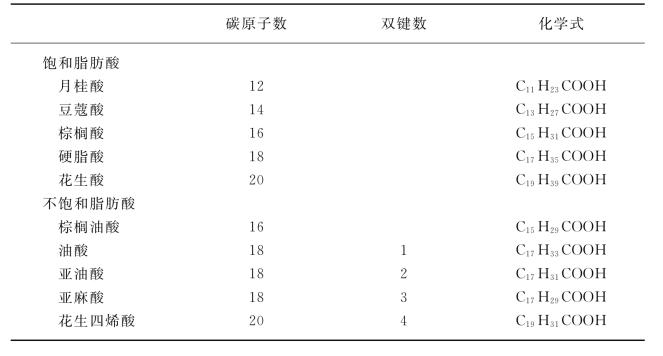 动物体内不能合成带有2~4个双键的不饱和脂肪酸,必须从食物中取得,因而这些脂肪酸就叫必需脂肪酸,也有人叫它维生素F。虽然已认为它们能降低血液中的胆固醇,但还没有证据能证明人会因为食物中缺乏这些脂肪酸而引起疾病。微生物中也含有不饱和脂肪酸,蓝细菌最独特之处是含有两个或多个双键组成的不饱和脂肪酸,而细菌通常只含有饱和脂肪酸和一个双键的不饱和脂肪酸。部分天然脂肪酸见表4-2。