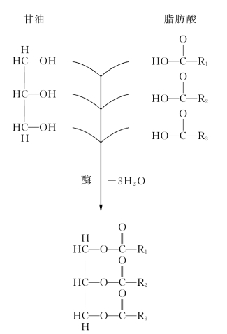 甘油与三个脂肪酸化合,在酶催化下经脱水就得到中性脂肪,如图4-31所示。