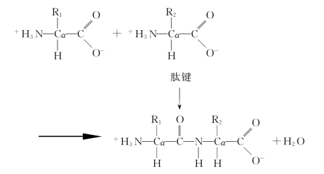 由一个氨基酸分子的羧基跟另一个氨基酸分子的氨基反应,失去一分子水而生成的物质叫二肽(见图5-7),所形成的键,叫做肽键。两个或两个以上氨基酸通过肽键共价连接形成的聚合物就叫作肽,其中很多氨基酸连接的叫做多肽,蛋白质基本上就是由长链的多肽组成的。