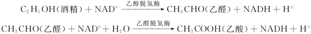 其中:参与反应的NAD+叫烟酰胺腺嘌呤二核苷酸;NADH叫还原型烟酰胺腺嘌呤二核苷酸。乙醇脱氢酶(ADH)是广泛分布于人和动物肝脏、植物及微生物细胞之中的含锌金属酶。乙醛对人体有害,但它又会很快在乙醛脱氢酶的作用下转化成能提供热量的乙酸。一个人如同时有着高活性的乙醇脱氢酶又有高活性的乙醛脱氢酶,在喝酒后又会大量出汗,这就表明酒精已迅速变成乙酸进入了柠檬酸循环而发热,那此人就一定是个“酒坛子”了。容易醉酒的人则是由于体内乙醛脱氢酶含量缺损影响了酒精的及时分解。