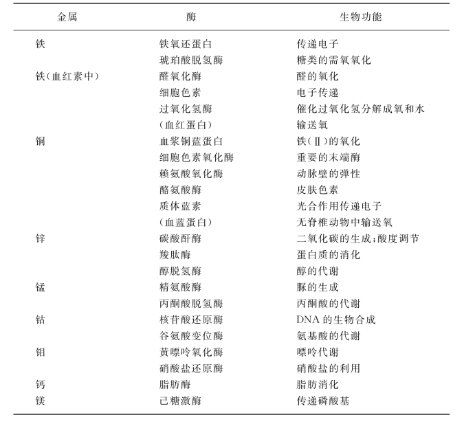 金属在酶分子中,或者作为酶活性中心部位的组成成分,或者帮助形成酶活性所必需的构象,其生物功能见表5-5。酶蛋白以自身侧链上的极性基团,通过反应以共价键、配位键或离子键与辅助因子结合。