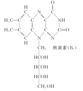 维生素B2又叫核黄素。早在1879年,英国化学家就发现在乳清中存在着一种黄绿色的荧光色素,他们用各种方法提取,但没有成功。1933年德国科学家库恩(Richard Kuhn)从牛奶中分离出核黄素,1935年他完成核黄素结构的测定(见图5-20)和人工合成,获得了1938年诺贝尔化学奖。维生素B2是橙黄色针状晶体,味微苦,水溶液有黄绿色荧光,在碱性或光照条件下极易分解。人体缺少它易患口腔炎、皮炎、微血管增生症等。