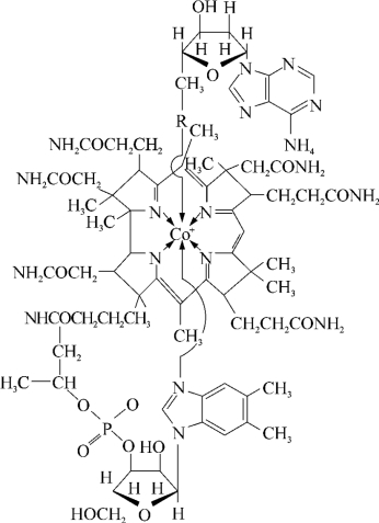 它是一种含有金属元素钴的维生素(结构式见图5-23),结构复杂,又叫氰钴素,是一种辅酶。它能协助某些转移甲基的酶发挥作用,参与体内一碳基团的代谢。维生素B12参加的许多代谢过程中最重要的是参与核酸和蛋白质的合成,它能促进细胞的发育和成熟。特别是促进红细胞成熟。缺钴时由于红细胞成熟延迟,会出现巨红细胞。这是因为维生素B12参与核酸合成,当它缺乏时,核酸合成受阻,红细胞就长得很大而不能正常成熟。维生素B12还能促进胃肠道对铁的吸收,使储存的铁动员出来参与造血,使之较易进入骨髓。缺乏维生素B12造成的恶性贫血,是无法用铁制剂治愈的,而只能用维生素B12治疗。