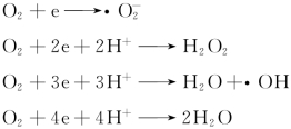 氧对人体有毒性是与氧自由基有着密切的关系的。氧自由基又是如何产生的呢?原来氧气在有机体内代谢中,提供了生物体所需的能量后生成了水,在这一还原过程中,每接受一个电子就产生一个氧自由基或活性氧,它们分别是超氧阴离子自由基、过氧化氢、羟基自由基,在接受了第四个电子后,最终就生成了水,其过程如下: