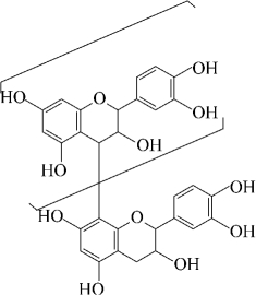 除了绿茶、大豆外,在葡萄酒、黑巧克力等食品中也存在着生物类黄酮,它们有着抗氧化、抑制血小板凝聚的功能,能保护心血管系统。另外,科学家还发现葡萄籽提取物——(低聚)原花青素(oligomers procyanodolic complexes,缩写为OPC),也系黄酮类化合物,化学结构式见图6-4。由于其分子结构中有着较多的羟基(酚基)部分,因此具有超强的抗氧化能力,能有效清除人体内自由基,据说已证实它在人体内的抗氧能力约是维生素E的50倍,是维生素C的20倍。