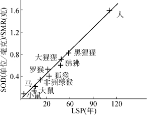 就SOD而言,科学家认为,如果衰老是自由基对细胞的破坏所造成的,那么生物体体内抗氧剂的多少将是消除这一损伤的重要因素,因此生物体内抗氧剂的含量和活性就应当与生物体的寿命相关。他们测量了12种灵长类和2种啮齿类动物脑、肝和心组织中的SOD含量,除以基础代谢速率(SMR),结果与寿限(LSP)有着非常好的相关性,相关系数r=0.998,其中寿命最长的人类具有最大的SOD/SMR,而寿命较短的动物有较小的SOD/SMR,如图6-2所示。所谓基础代谢指的是人体在基础状态下的能量代谢,即是指人处在清醒而又非常安静,不受肌肉活动、环境温度、食物及精神紧张等因素影响时的状态。单位时间内的基础代谢称为基础代谢率。从图6-2上可以看出,一个物种一生所利用氧的总量,可能是和体内SOD的量成正比的。