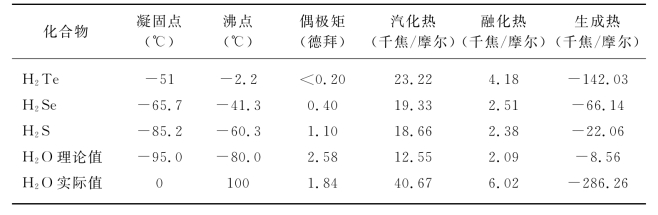 水是氧的氢化物,与氧族其他元素的氢化物相比,水有着不寻常的特点(见表6-2),水在生命中举足轻重的地位是与水独特的化学性质分不开的。