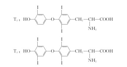图7-1 L-3,5,3′-三碘甲状腺原氨酸(T3)和L-3,5,3′,5′-四碘甲状腺原氨酸(T4