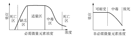 在关于微量元素的研究中,生命体中微量元素的缺乏与过量所导致的效应是重要的研究课题之一。有关微量元素在生命中的宏观上的表现,科学家们已作了许多的研究,生物的必需微量元素与其生物功能效应的曲线图就是其中之一(见图7-3)。它表明:必需微量元素缺乏与过量时对生物生长都有着重要的影响,非必需元素与其的差别一般在于它们没有缺乏区和最适区,而只有一个可耐受区,当然这也不是绝对的。