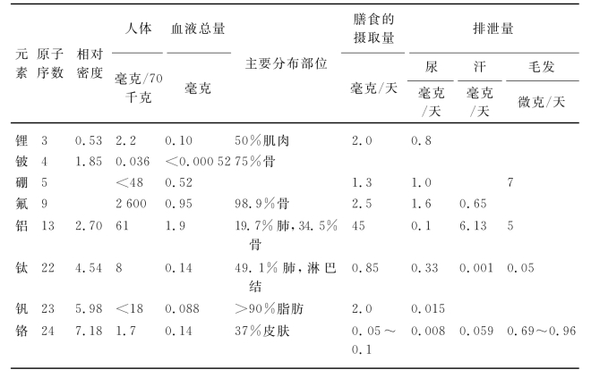 生命科学家对人体中微量元素的分布如同对主量元素的研究一样做了大量的研究工作,表7-6中给出了人体中的微量元素的分布以及从食物中摄取和排泄的情况。一般来说,在人体中微量元素蓄积最多的部位应是肝脏、肾脏和血液。表7-7中给出了人体中某些金属的化验正常值。