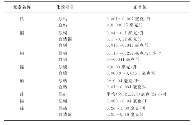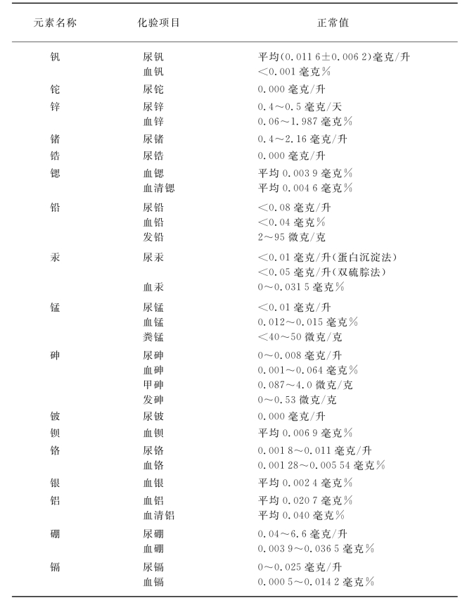 从上述表中还可以看出,临床医学所需要大量关于人体中微量元素的数据主要是来自对血、尿和头发的检测。对于这三类样品所测得的数据,要注意它们之间存在着一定的差异。由于心理上的作用,验血总是受到病人的排斥;而小便又不稳定,更易受到短期的体内变化以及外部因素的干扰。这两者化验的结果都是瞬时数据,反映的只是在并不长的间隔时间中人体微量元素的变化情况,适合于诊断急性疾病。而头发就不一样了,它取样方便,数据也稳定,反映的则是相当长的一段时间中微量元素的变化情况,但它不是即时情况,有着滞后性,适合于长期的慢性疾病的分析。发样的分析在过去还常受到仪器和检测能力的限制,但如今对于一般医院来说已不成问题。