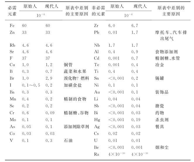 从表7-8中,可以看出,现代人和原始人在必需微量元素铬、锰含量上已有很大差异,更令人忧虑的是,现代人体中的环境污染元素如砷、铅、汞、镉、铝等的含量已是原始人的数倍乃至数百倍。