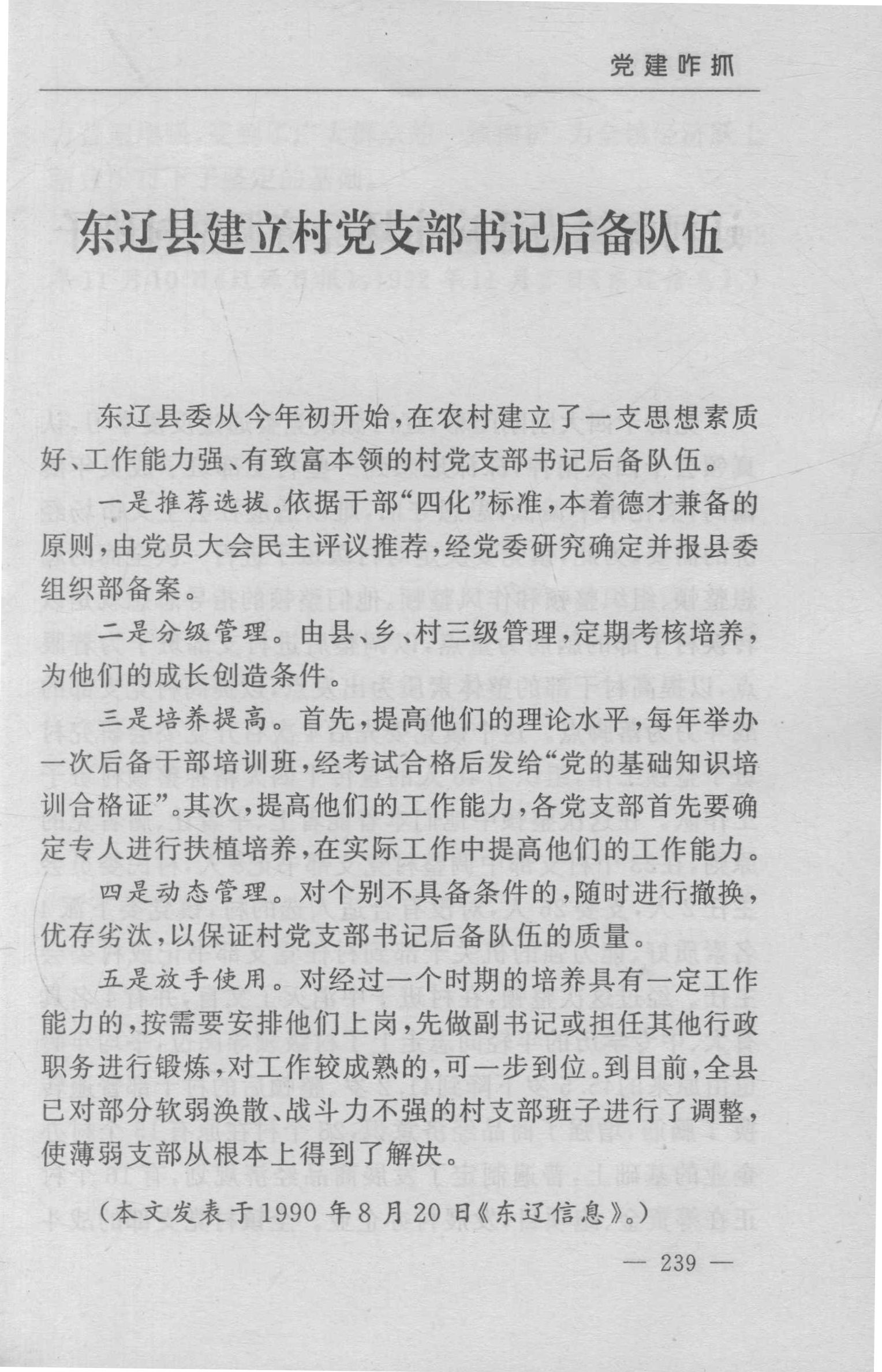 东辽县建立村党支部书记后备队伍
