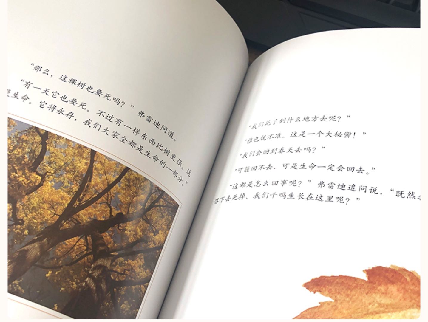 冬天,面对死亡,弗雷迪开始有些恐惧,有些挣扎,但他最终静静地温和地躺在树的根部。因为他懂得了,他曾经和同伴们一起度过了快乐的时光,曾经给老人、孩子带来了阴凉,曾经把秋天变得缤纷,也完整地经历了四季,而且死亡是为了让树更强壮,为了明年春天新叶的生机。虽然我不愿意弗雷迪离去,但我知道生命的结束是一种自然规律。我们的一生是短暂的,我们一定要在这精彩的世界里活出自己的价值,给自己和别人带来快乐!手里捧着这本薄薄的书,心里却觉得无比沉重。我读了一遍又一遍,和弗雷迪一起走过了四季,和他一同感悟生命的力量,直到读第五遍才明白:我们都是生命的一部分,而每个生命都有自己独特的意义,都值得骄傲,也值得尊敬。