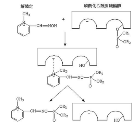 临床上抢救有机磷中毒患者时需要静脉缓慢注射AchE复活剂—解磷定和阿托品。解磷定是肟类化合物,常用的有氯磷定和碘解磷定。解磷定吡啶环上的带正电荷的季胺氮能被磷酰化AchE的阴离子部分吸引,而其肟基与磷原子有较强的亲和力,由此能使AchE游离出来而使酶复活,解除有机磷中毒症状(见图)。阿托品是抗胆碱药,有阻断乙酰胆碱对副交感神经和中枢神经系统毒蕈碱受体(M受体)的作用,有缓解M样症状的作用,对烟碱样(N样)症状无效。阿托品不能使失活的AchE复活。