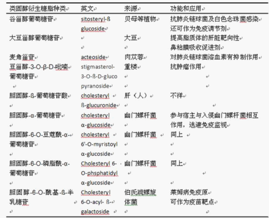 大多数植物和菌类、少数动物和细菌能够合成类固醇衍生糖脂及其衍生物,参与其生物合成的相关酶类主要包括NDP-糖-固醇糖苷糖基转移酶,固醇糖苷水解酶,固醇糖苷酰基转移酶和固醇糖苷磷脂酰转移酶等。与游离的固醇及甘油磷脂相比,类固醇衍生糖脂在细胞内含量很少,其生物物理学特性与游离的固醇类也明显不同。已有研究证实,部分亚型类固醇衍生糖脂参与修饰细胞膜特性、给予细胞冷冻及热激抵抗力以及生物分子的运输和转运、调节脂质代谢和免疫等功能。目前对于类固醇衍生糖脂及其衍生物的提取、纯化及应用研究多集中在植物,其结构复杂,种类繁多。下表列出了常见的类固醇衍生糖脂种类、来源及功能和应用。