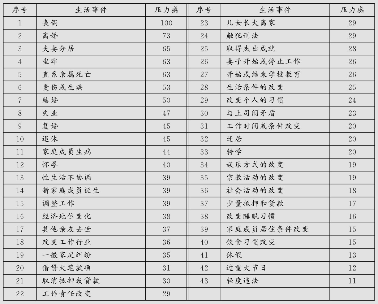 生活事件与压力感量表是在1967年由心理学家霍曼和瑞希编制的,列出了43种大部分人都可能经历的生活事件。由400位不同职业、阶层、身份、年龄的人对这些事件产生的压力大小打分,发现其中24个项目直接与家庭内人际关系的变化有关。