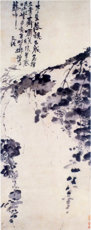 继陈淳之后,徐渭从根本上完成了水墨写意花鸟画的变革,绘画极具创造力。他往往赋予花卉以强烈的主观情感,擅以狂草般的笔法纵情挥洒,泼墨淋漓,在“似与不似之间”的花木形象中,着眼于气韵的体现,同时抒发“英雄失路,托足无门”的悲愤与历劫不磨的旺盛生命力,代表作有《杂花卷》《墨葡萄》(图1-15)等。徐渭把中国写意花鸟画推向了能够强烈抒写内心情感的极高境界,把在生宣纸上充分发挥并随意控制笔墨的表现力提高到前所未有的水平,成为中国写意花鸟画发展中的里程碑。