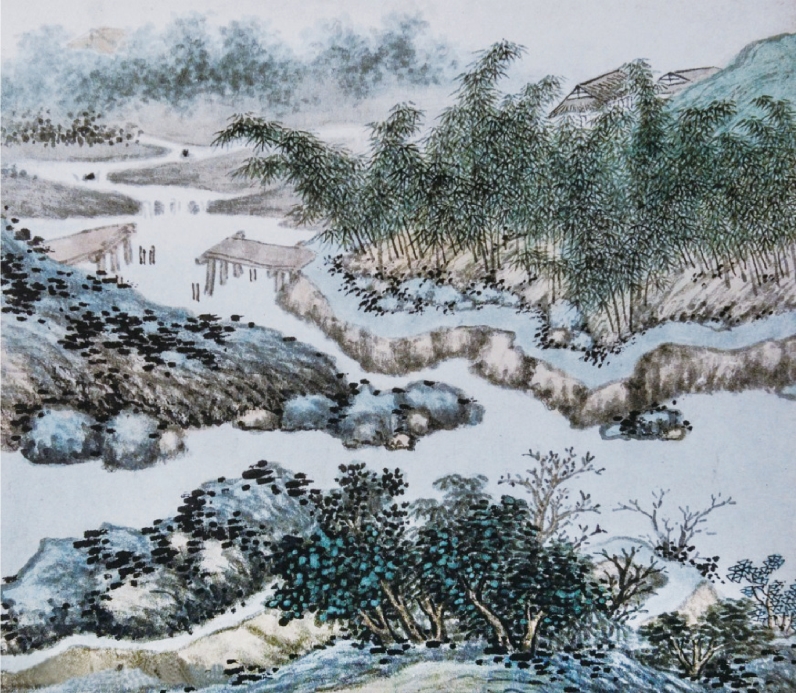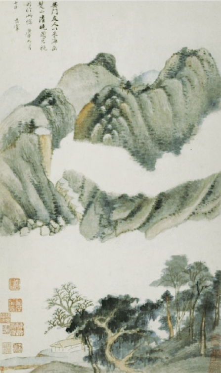 明时期在山水画方面的杰出代表画家是董其昌。他在山水画的创作中,追求以书法入画所导致的笔墨变幻中的表现力,并把宋元诸家绘画中来自大自然的山石树木形象加以简化,以笔势的运动做“不似之似”的组合。重笔墨,求士气,以禅论画,提出“南北宗”论,推崇“南宗”为文人画之正脉,成为当时画坛盟主。其代表作有《高逸图》《秋兴八景图册》(图1-14)等。