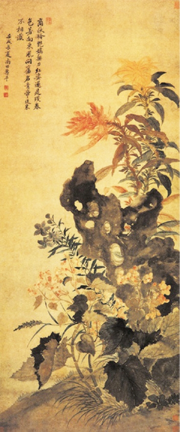 早期画坛因画家不同的追求而在文人画领域出现以“四王”“吴恽”(吴历、恽寿平)为代表的两种趋向。画家们更追求笔墨情趣,风格技巧争奇斗艳。王时敏、王鉴、王翚、王原祁被称为“四王”,他们是依董其昌开辟的道路力图集古人之大成的代表,在画学思想和创作方法上受到董其昌的深刻影响。他们的代表作分别有王时敏的《云山图》、王鉴的《梦境图》、王翚的《溪山红树图》、王原祁的《山中早春图》等。与此同时,与“四王”齐名的吴历与恽寿平成就也颇为显著。吴历的作品丘壑生动多姿,笔墨苍魂凝练,用笔沉着谨严,善用重墨、积墨,风格醇厚深秀。其代表作有《横山晴霭图》等。恽寿平早年的创作主要是山水画,师法元人,并上溯董源、巨然,作品空灵清旷。中年以后专攻花卉,创没骨画法,以色彩直接渲染,粉笔带脂,点染并用,讲究以写生为基础,画风清新雅丽,淡冶秀美,于绚烂中求平淡天真。代表作有《锦石秋花图》(图1-16)等。