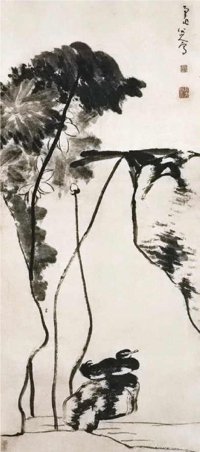 清初画坛呈现出繁荣景象,除了清初六家外,还有清代“四僧”也十分活跃。清代“四僧”包括八大山人、石涛、髡残和弘仁四位出家为僧的画家。他们都是由明入清的遗民画家,具有较强的反清意识,他们把所经历的坎坷遭遇借助绘画的形式宣泄出来。他们所继承的传统仍属于文人画系统,受徐渭影响较大,十分重视生活感受,观察自然和独抒性灵,丰富了自然美的表现和意境的创造,发展了笔墨技法。他们的艺术风貌虽各不相同,但在当时都是十分新颖大胆的创造。代表作有八大山人的《荷鸭图》(图1-17)、石涛的《牡丹竹石图》、髡残的《苍翠凌天图》、弘仁的《黄海松石图》等。