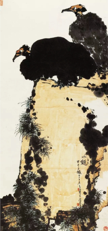 潘天寿的花鸟画雄浑奇崛、苍古高华,具有深厚的传统功力。他精于写意花鸟和山水,偶作人物,尤善画鹰、八哥、蔬果及松、梅等。落笔大胆,点染细心,墨彩纵横交错,画面布局严谨而又能出奇制胜,倾向于豪放奇崛一格。代表作有《小憩图》(图1-21)、《八哥崖石图轴》等。