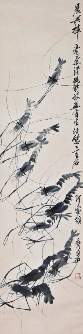 近现代的北京画家云集,著名的画家有陈师曾、齐白石等。陈师曾具有深厚的学养和书画功底,艺术感受力和表现力很强,其作品笔墨之老到、形象之生动、格调之高雅,在当时是不可多得的。其代表作有《读画图》《北京风俗》等。齐白石笔下花鸟鱼虫形象生动,“妙在似与不似之间”,代表作有《群虾图》(图1-20)等。他把自己对诗的涵养化为画的情趣,勾画出具有诗的魅力的艺术形象,比如蝌蚪追逐水面上的荷花倒影,小老鼠在打灯油的主意等,画面富有独特的魅力。