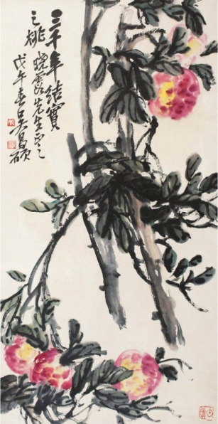 19世纪中叶,上海经济发展迅速,吸引了江浙一带的众多画家,但是居主流地位的则是被称为“海派”的群体。海派分为前后两个时期,前期从张熊、朱熊、任熊算起,任熊、任熏兄弟及其学生任颐又并称“海上三任”,以任颐为高峰,代表作《苏武牧羊》《雪中送炭》《钟馗》《春江水暖图》等;晚期“海派”则以吴昌硕为巨挚,他用墨浓淡干湿,各得其宜,表现出物体的内在气质和生命力,并传达出超乎形似的神韵,给人以出神入化的艺术享受,代表作有《三千年结实》(图1-19)等;被视为“海派”名家,但未定居上海的有赵之谦和虚谷,造诣极深。海派画家善于把诗、书、画、印一体的文人画传统与民间美术传统结合起来,将明清大写意水墨画技艺和金石艺术中刚健雄强的审美特色、强烈鲜艳的色彩融会贯通,描写民间喜闻乐见的题材,形成雅俗共赏的新风貌。