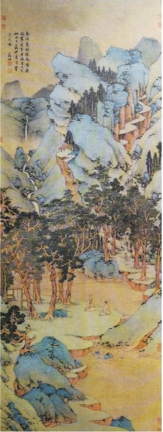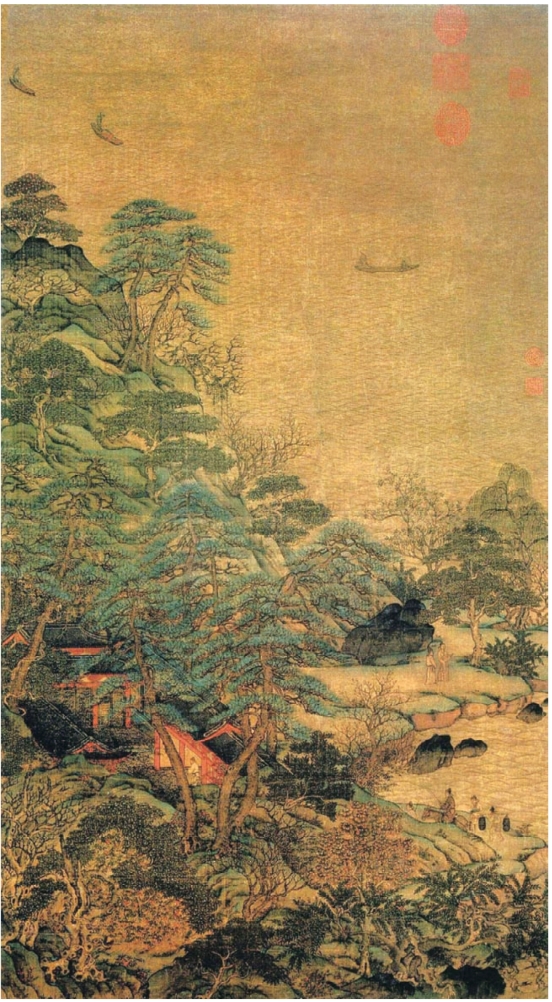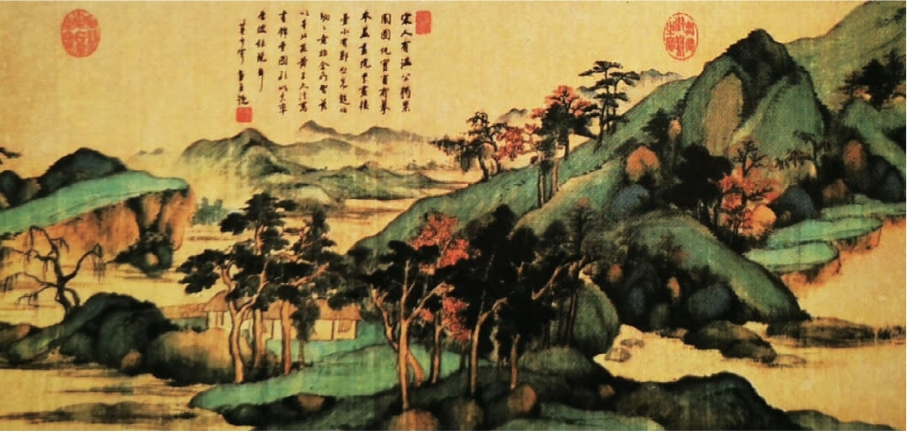 、王蒙,布景繁密,较少空间纵深,造型规整,时见棱角和变形,用笔细密,稍带生涩,于精熟中见稚拙。设色多青绿重彩,间施浅绛,于鲜丽中见清雅(图6-15)。