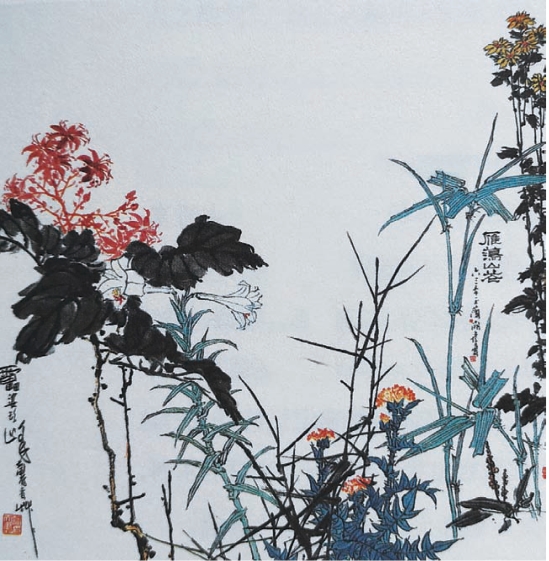 在当代绘画大师中,潘天寿先生是很讲究构图形式的,《雁荡山花图》就是其典型的作品。其题材虽是极平常的花草,但构图布局却充分体现了疏密、虚实的关系。潘天寿先生在谈中国画构图时强调:“平行线没有交叉点是最呆板的线。故作画时,注意线与线不要平行,线与画边不要平行。”此图总的倾向是纵向平行线,潘天寿先生运用巧妙的穿插、交叉、疏密技法使画面丰富多姿、杂而不乱、生机盎然。一丛野菊从画外伸进,长长的枝干形成一条斜线,既破了画边的平行线,又使人产生画外之景的联想(图6-26)。