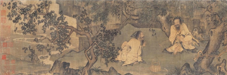 《采薇图》是以殷末伯夷、叔齐“不食周粟”的故事为内容的历史题材绘画作品。画面采用截取式构图,绘半山之腰,苍藤、古松之阴,伯夷与叔齐采摘薇蕨,其间正在休息对话的情景。李唐把两位主人公画得笔墨劲秀,衣纹简劲爽利,树石笔墨粗简,墨色湿润,人物神态生动,殷殷凄凄,若有声出绢素(图6-8)。