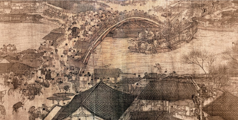 北宋著名画家张择端的长卷风俗画《清明上河图》,是我国绘画史上的稀世奇珍,画之瑰宝。它用现实主义手法,全景式构图,生动细致地描绘了北宋时王都开封汴京的舟船往复、飞虹卧波、店铺林立、人烟稠密的繁华景象和社会生活习俗风情。全图规模宏大,结构严密,构图起伏有序。其笔墨技巧兼工带写,活泼简练,人物生动传神,牲畜形态、房舍、舟车、城郭、树木桥梁、河流无一不臻至妙,称得上妙笔神工(图6-7)。