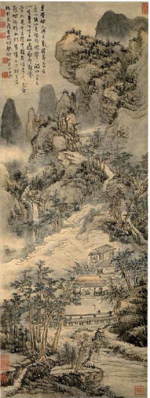 、王蒙、吴镇三家,自成一格。画风呈粗、细两种面貌。粗笔源自沈周、吴镇,兼取赵孟