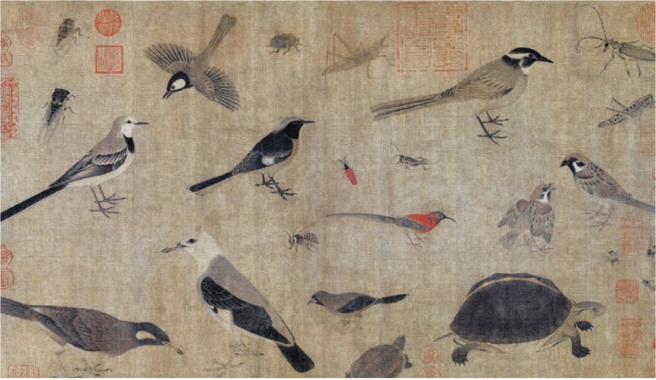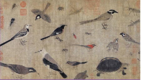 《写生珍禽图》用细密的线条和浓丽的色彩,描绘了大自然的众多生灵。在尺幅不大的绢素上,画家画了昆虫、鸟雀及龟类共二十四只,均以细劲的线条画出轮廓,然后赋以重彩。这些动物的造型准确、严谨,特征鲜明。每一动物的神态都画得活灵活现,富有情趣,耐人寻味。该画紧紧抓住动植物与人们生活遭际、思想情感的某种联系而给以强化表现。它既重视真实,同时又非常注意美与善的观念的表达,强调其“夺造化而移精神遐想”的怡情作用,主张通过花鸟画的创作与欣赏影响人们的志趣、情操与精神生活,表达作者的内在思想与追求(图6-5)。