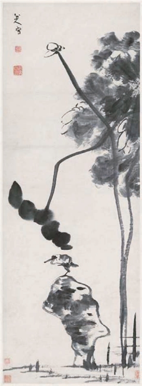 《荷花水鸟图》是清代杰出画家朱耷的作品。该作品描述的意境是:孤石倒立,疏荷斜挂,一只翻着白眼的缩脖水鸟独立于小头朝下的怪石之上。从朱耷《荷花水鸟图》这一类作品中,人们很容易察觉作者怪诞、冷漠、高傲、孤独、白眼向人的个性特征。他作画常取枯枝败叶、孤影怪石,表现他心中那种残山剩水、地老天荒的精神世界,极具强烈的艺术个性(图6-20)。